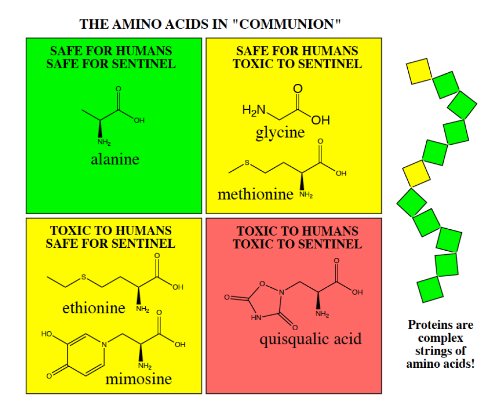 We needed some compatibility, in the form of amino acids used by both humans and the Sentinel. But what if some were used by one but not the other? Or were food to the Sentinel but poison to humans?