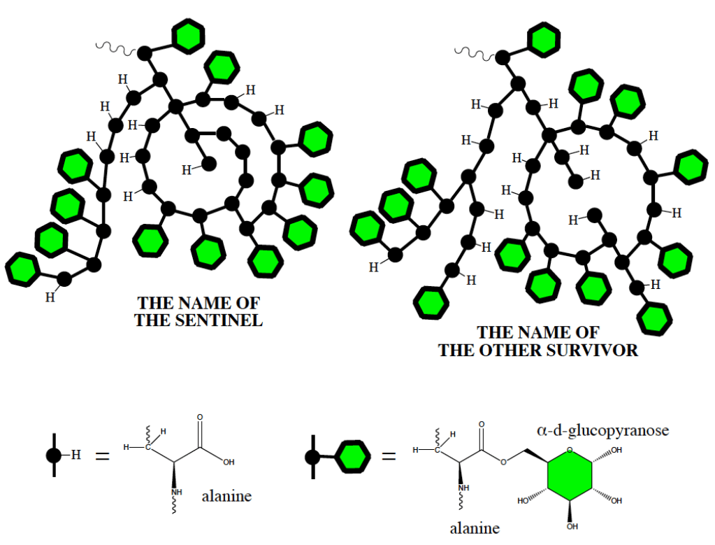 As we mentioned, the Sentinel uses proteins for all sorts of things, including communication. In the story, there’s another bacterium (“The Other Survivor”), and they write their names as complex strings of alanines, decorated with sugars.